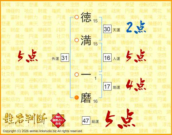 生活面を象徴する運勢です。外部から受ける影響力を表し、結婚運、家庭運や職場、環境への順応性を表します。総運から人運を引いた画数。姓や名が1文字の場合を除く。