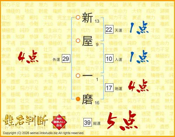 新屋一磨さんの総運は39画の5点!