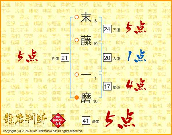 末藤一磨さんの総運は41画の5点!
