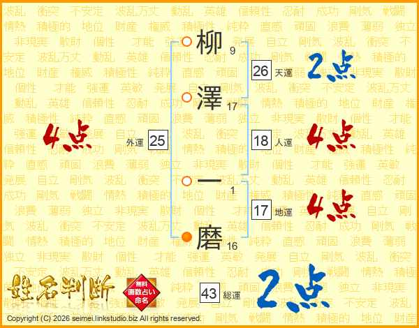 柳(9画)澤(17画) 一(1画)磨(16画)