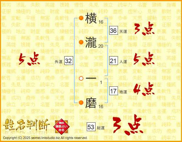 生活面を象徴する運勢です。外部から受ける影響力を表し、結婚運、家庭運や職場、環境への順応性を表します。総運から人運を引いた画数。姓や名が1文字の場合を除く。