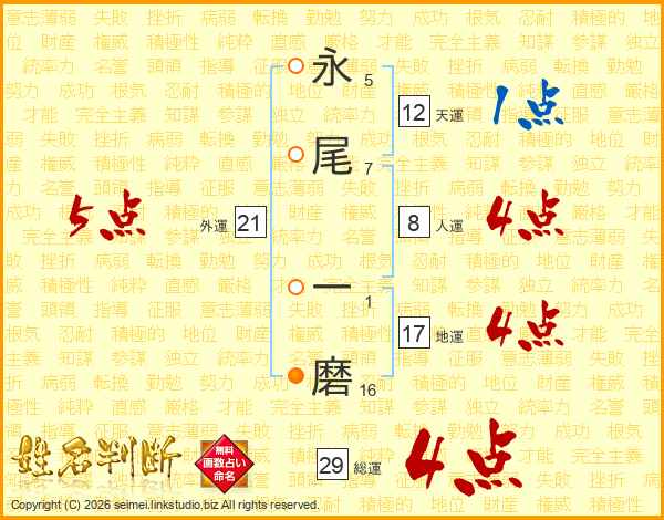 永尾一磨さんの総運は29画の4点!