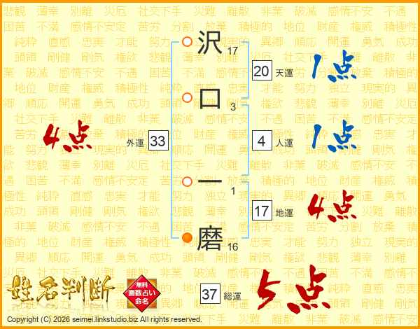 生活面を象徴する運勢です。外部から受ける影響力を表し、結婚運、家庭運や職場、環境への順応性を表します。総運から人運を引いた画数。姓や名が1文字の場合を除く。
