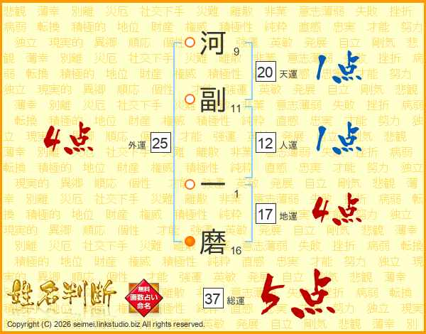 生活面を象徴する運勢です。外部から受ける影響力を表し、結婚運、家庭運や職場、環境への順応性を表します。総運から人運を引いた画数。姓や名が1文字の場合を除く。