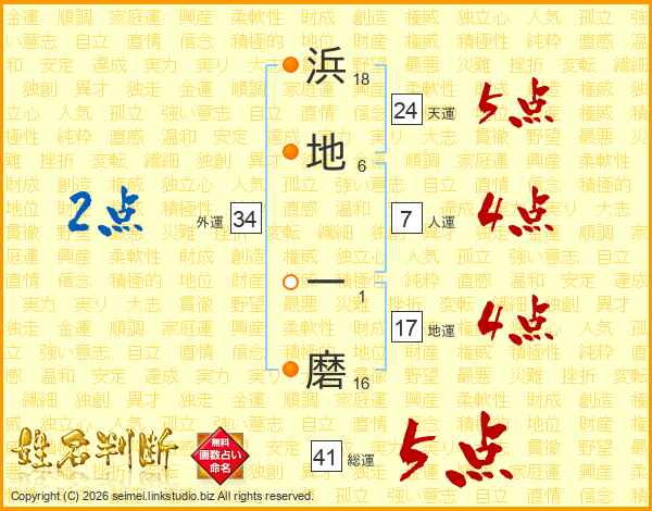 生活面を象徴する運勢です。外部から受ける影響力を表し、結婚運、家庭運や職場、環境への順応性を表します。総運から人運を引いた画数。姓や名が1文字の場合を除く。