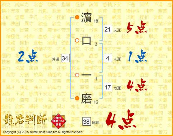 生活面を象徴する運勢です。外部から受ける影響力を表し、結婚運、家庭運や職場、環境への順応性を表します。総運から人運を引いた画数。姓や名が1文字の場合を除く。