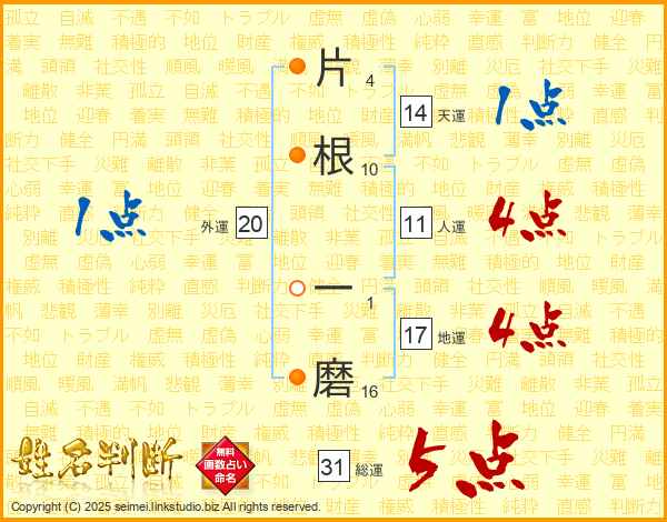 生活面を象徴する運勢です。外部から受ける影響力を表し、結婚運、家庭運や職場、環境への順応性を表します。総運から人運を引いた画数。姓や名が1文字の場合を除く。