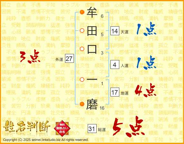 牟(6画)田(5画)口(3画) 一(1画)磨(16画)