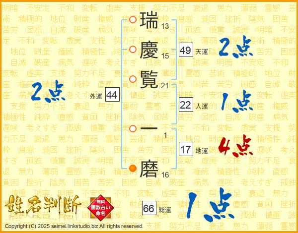瑞(13画)慶(15画)覧(21画) 一(1画)磨(16画)