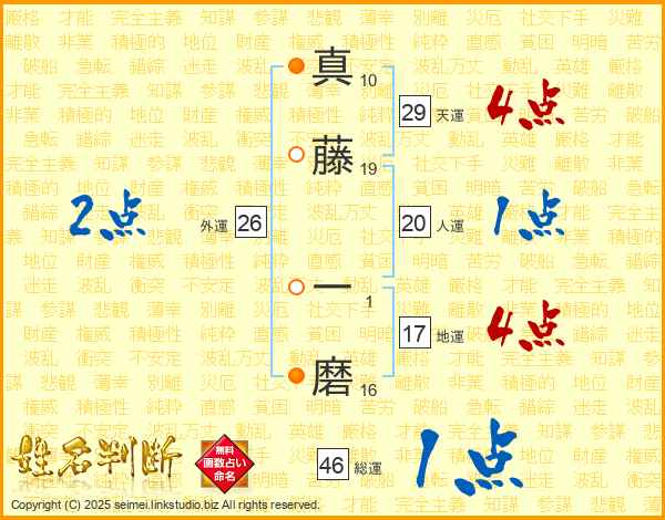 生活面を象徴する運勢です。外部から受ける影響力を表し、結婚運、家庭運や職場、環境への順応性を表します。総運から人運を引いた画数。姓や名が1文字の場合を除く。