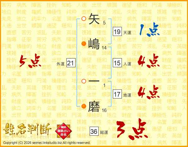 矢(5画)嶋(14画) 一(1画)磨(16画)