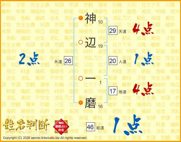 生活面を象徴する運勢です。外部から受ける影響力を表し、結婚運、家庭運や職場、環境への順応性を表します。総運から人運を引いた画数。姓や名が1文字の場合を除く。
