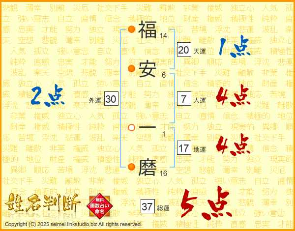 生活面を象徴する運勢です。外部から受ける影響力を表し、結婚運、家庭運や職場、環境への順応性を表します。総運から人運を引いた画数。姓や名が1文字の場合を除く。