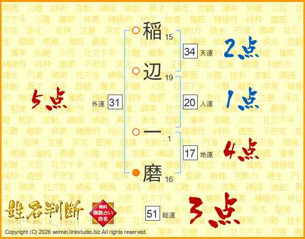 稲(15画)辺(19画) 一(1画)磨(16画)