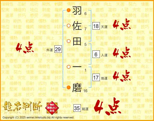羽(6画)佐(7画)田(5画) 一(1画)磨(16画)