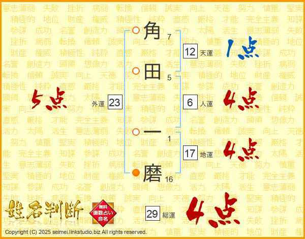 生活面を象徴する運勢です。外部から受ける影響力を表し、結婚運、家庭運や職場、環境への順応性を表します。総運から人運を引いた画数。姓や名が1文字の場合を除く。