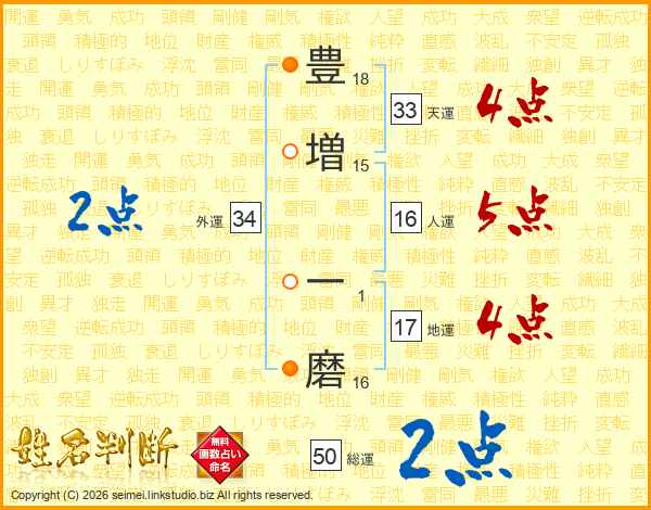 豊(18画)増(15画) 一(1画)磨(16画)