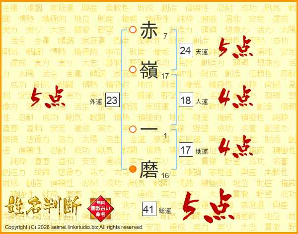 赤(7画)嶺(17画) 一(1画)磨(16画)