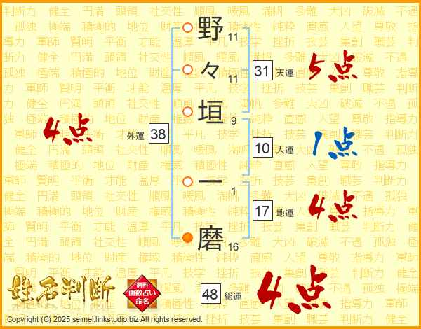 野(11画)々(11画)垣(9画) 一(1画)磨(16画)