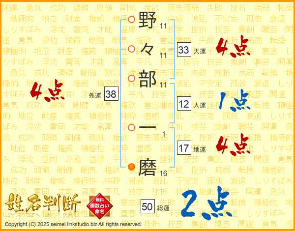 野(11画)々(11画)部(11画) 一(1画)磨(16画)