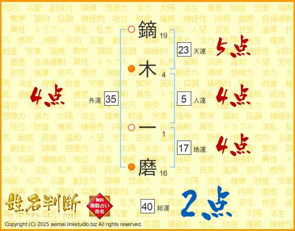 生活面を象徴する運勢です。外部から受ける影響力を表し、結婚運、家庭運や職場、環境への順応性を表します。総運から人運を引いた画数。姓や名が1文字の場合を除く。