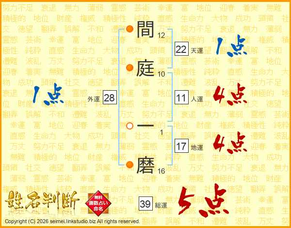 生活面を象徴する運勢です。外部から受ける影響力を表し、結婚運、家庭運や職場、環境への順応性を表します。総運から人運を引いた画数。姓や名が1文字の場合を除く。