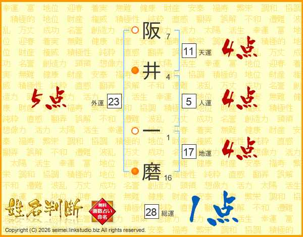 生活面を象徴する運勢です。外部から受ける影響力を表し、結婚運、家庭運や職場、環境への順応性を表します。総運から人運を引いた画数。姓や名が1文字の場合を除く。