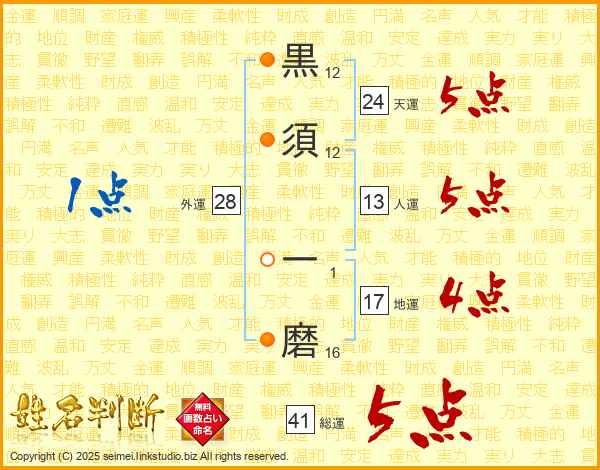 あなたの人生を表す1番重要な運勢です。生涯を通じて影響する総合運となり、主に50歳以降の晩年期に影響を及ぼします。苗字と名前の合計画数。
