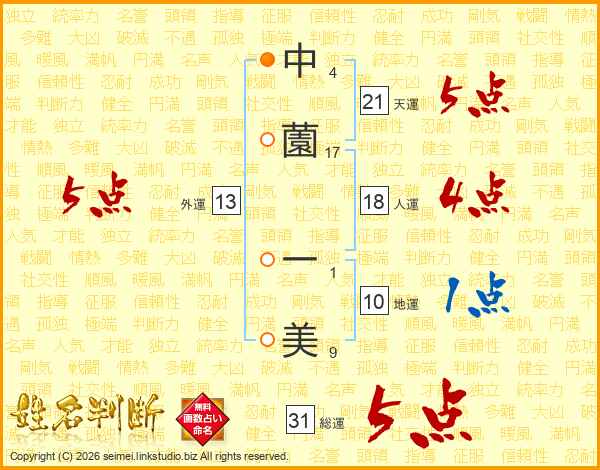 生活面を象徴する運勢です。外部から受ける影響力を表し、結婚運、家庭運や職場、環境への順応性を表します。総運から人運を引いた画数。姓や名が1文字の場合を除く。