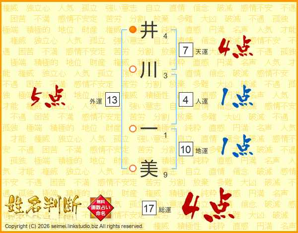 生活面を象徴する運勢です。外部から受ける影響力を表し、結婚運、家庭運や職場、環境への順応性を表します。総運から人運を引いた画数。姓や名が1文字の場合を除く。