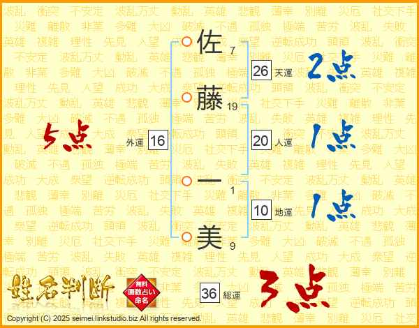 生活面を象徴する運勢です。外部から受ける影響力を表し、結婚運、家庭運や職場、環境への順応性を表します。総運から人運を引いた画数。姓や名が1文字の場合を除く。