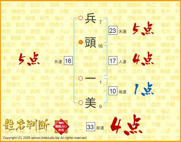 生活面を象徴する運勢です。外部から受ける影響力を表し、結婚運、家庭運や職場、環境への順応性を表します。総運から人運を引いた画数。姓や名が1文字の場合を除く。