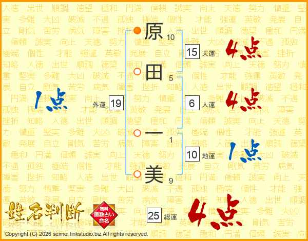 生活面を象徴する運勢です。外部から受ける影響力を表し、結婚運、家庭運や職場、環境への順応性を表します。総運から人運を引いた画数。姓や名が1文字の場合を除く。