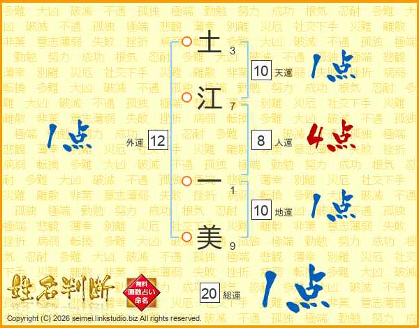 生活面を象徴する運勢です。外部から受ける影響力を表し、結婚運、家庭運や職場、環境への順応性を表します。総運から人運を引いた画数。姓や名が1文字の場合を除く。