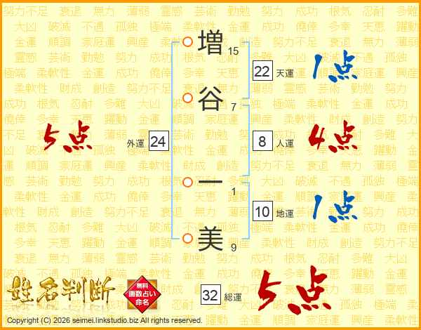生活面を象徴する運勢です。外部から受ける影響力を表し、結婚運、家庭運や職場、環境への順応性を表します。総運から人運を引いた画数。姓や名が1文字の場合を除く。