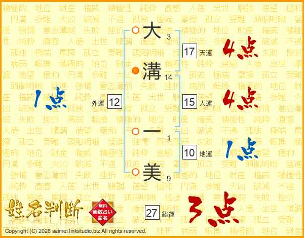 生活面を象徴する運勢です。外部から受ける影響力を表し、結婚運、家庭運や職場、環境への順応性を表します。総運から人運を引いた画数。姓や名が1文字の場合を除く。