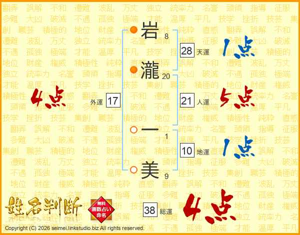 岩(8画)瀧(20画) 一(1画)美(9画)