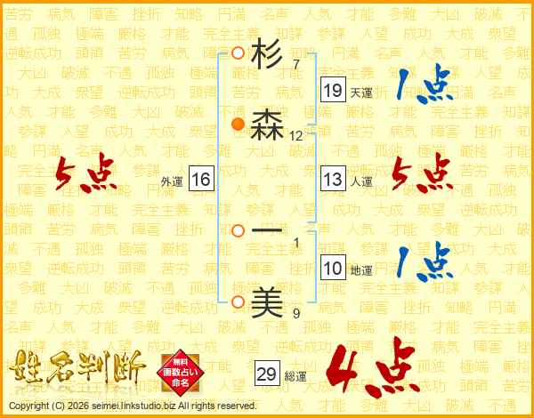生活面を象徴する運勢です。外部から受ける影響力を表し、結婚運、家庭運や職場、環境への順応性を表します。総運から人運を引いた画数。姓や名が1文字の場合を除く。