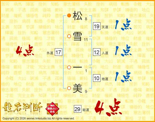 生活面を象徴する運勢です。外部から受ける影響力を表し、結婚運、家庭運や職場、環境への順応性を表します。総運から人運を引いた画数。姓や名が1文字の場合を除く。