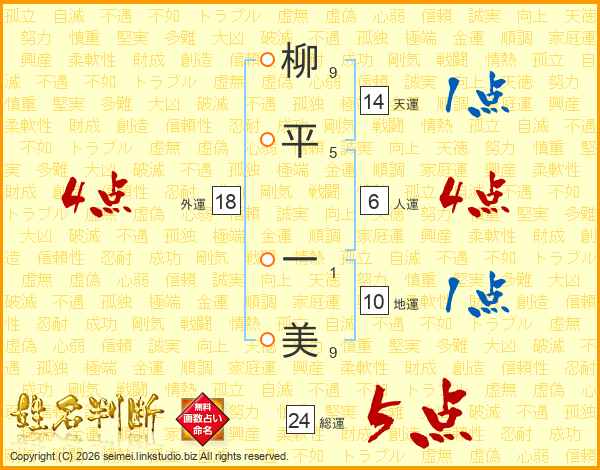 生活面を象徴する運勢です。外部から受ける影響力を表し、結婚運、家庭運や職場、環境への順応性を表します。総運から人運を引いた画数。姓や名が1文字の場合を除く。