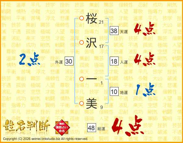 生活面を象徴する運勢です。外部から受ける影響力を表し、結婚運、家庭運や職場、環境への順応性を表します。総運から人運を引いた画数。姓や名が1文字の場合を除く。