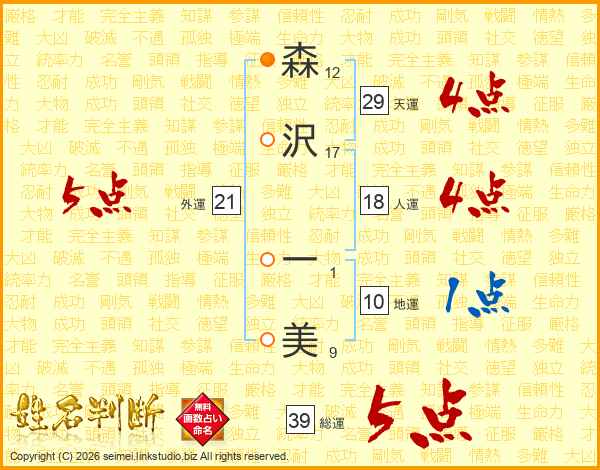 森沢一美さんの総運は39画の5点!