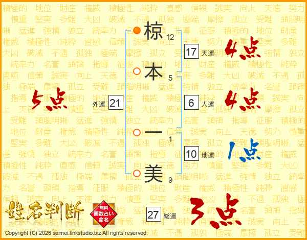 あなたの人生を表す1番重要な運勢です。生涯を通じて影響する総合運となり、主に50歳以降の晩年期に影響を及ぼします。苗字と名前の合計画数。