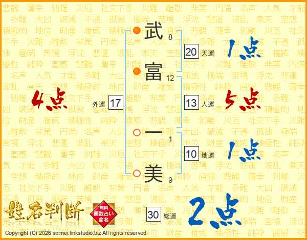 武(8画)富(12画) 一(1画)美(9画)