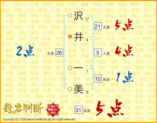 生活面を象徴する運勢です。外部から受ける影響力を表し、結婚運、家庭運や職場、環境への順応性を表します。総運から人運を引いた画数。姓や名が1文字の場合を除く。