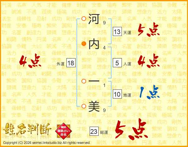 河(9画)内(4画) 一(1画)美(9画)