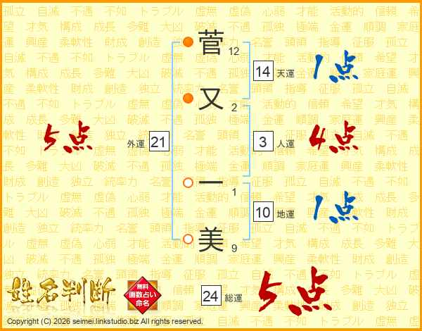 菅(12画)又(2画) 一(1画)美(9画)