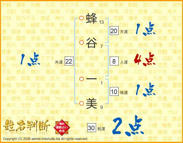 蜂(13画)谷(7画) 一(1画)美(9画)