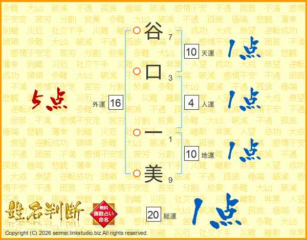 生活面を象徴する運勢です。外部から受ける影響力を表し、結婚運、家庭運や職場、環境への順応性を表します。総運から人運を引いた画数。姓や名が1文字の場合を除く。