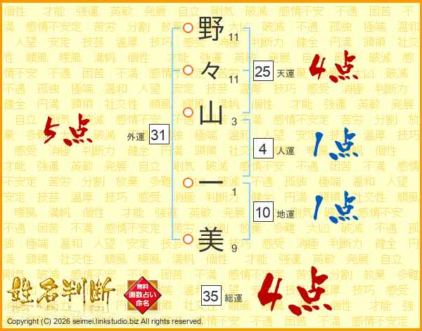 野(11画)々(11画)山(3画) 一(1画)美(9画)